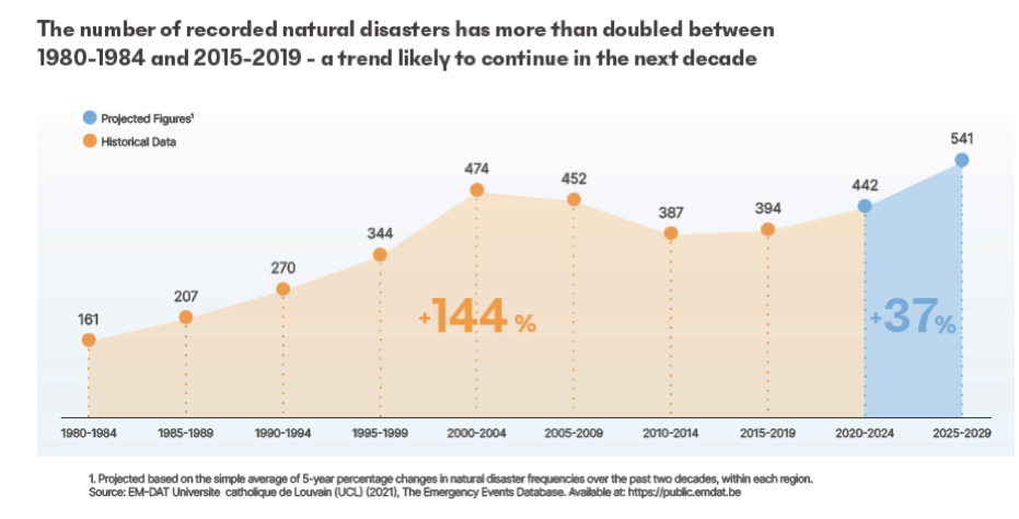 The whitepaper sheds light on the different economic outcomes resulting from increased natural disasters occurring at a global scale. The study shows that though most types of weather-related disasters are likely to affect countries of all income groups, the economic burden in low-income countries is disproportionate. With less resources, know how, policies in place, investment on infrastructure, equipment and in training, low-income jurisdictions are particularly vulnerable to the consequences of climate change. For instance, breaking down by regions, Asia Pacific is expected to incur the greatest economic damage at USD 165 billion from 2025-29, or 42% of the total.